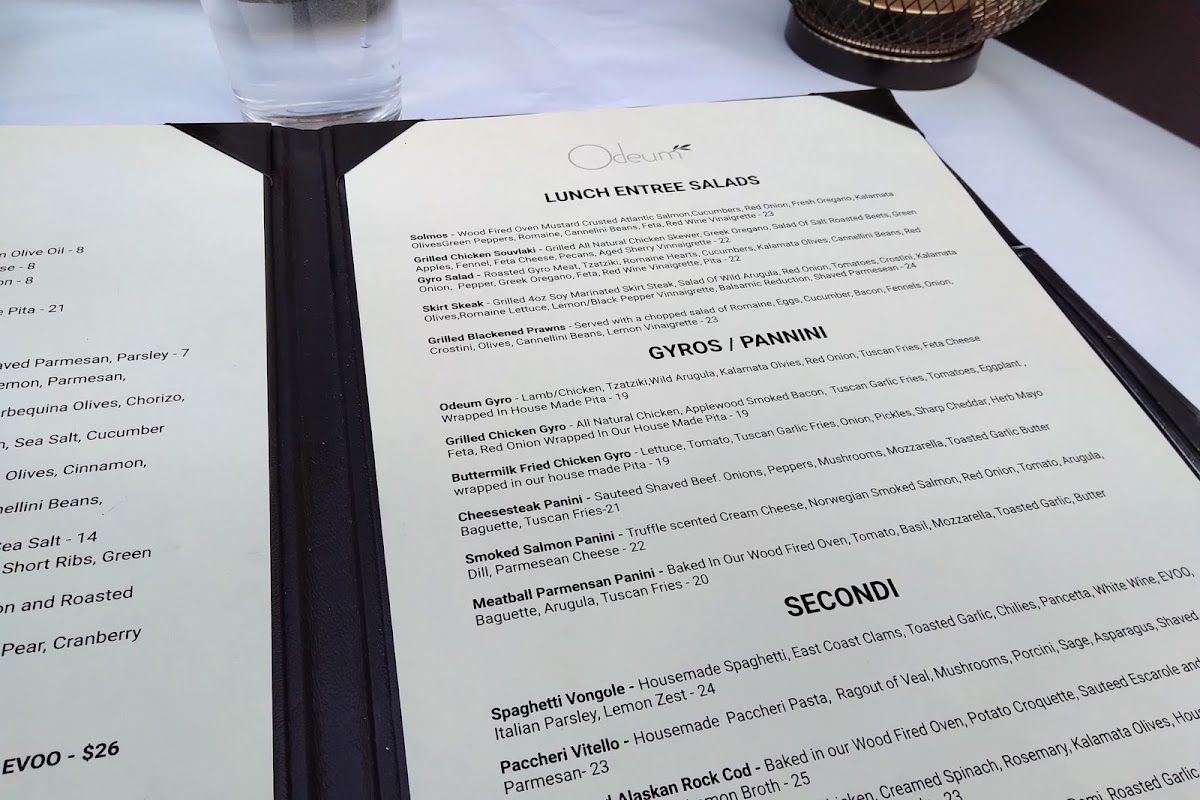Dijon and herb-crusted salmon, zucchini spaghetti, cannellini beans, ouzo-tomato broth, kalamata olives, and basil.